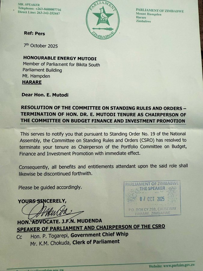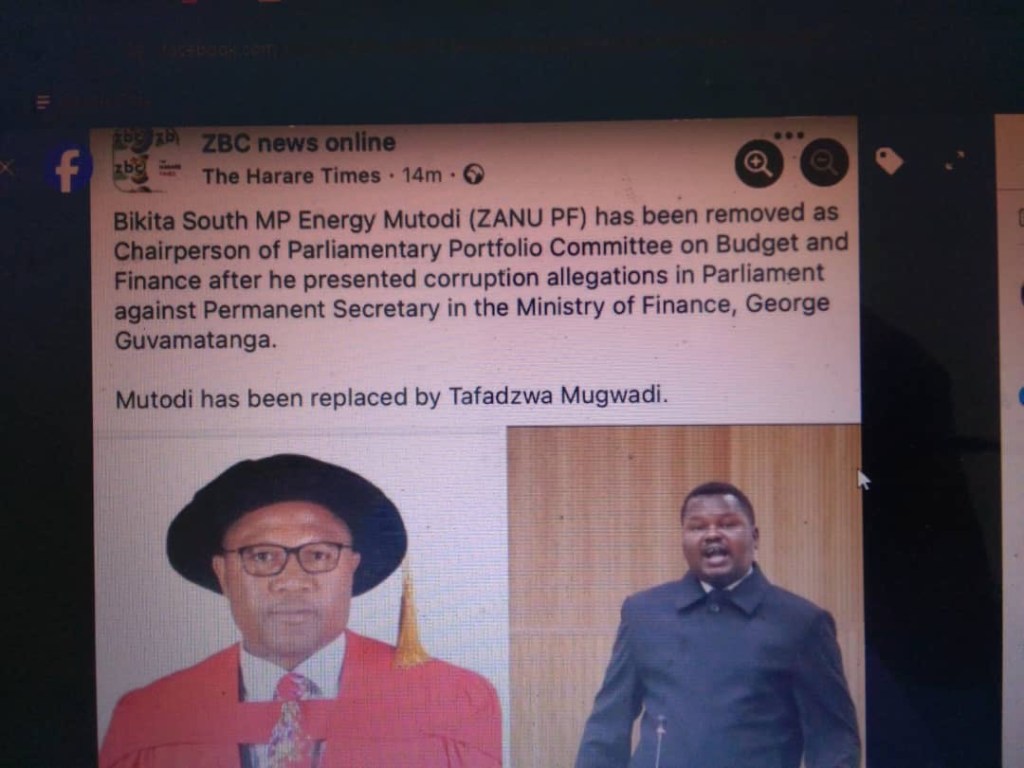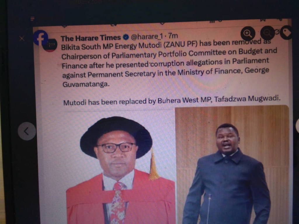 HARARE-A post on X, supposedly from state controlled broadcaster, the Zimbabwe Broadcasting Corporation (ZBC) has claimed that ZANU PF Bikita South legislator Energy Mutodi has been dismissed as chair of parliament’s budget, finance and economic development committee and replaced by Tafadzwa Mugwadi, the party’s Buhera West legislator.