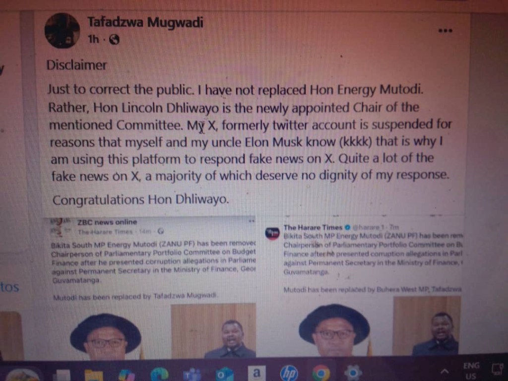 While Parliament had not posted Mutodi’s replacement, Mugwadi, former ZANU PF information director, took to Facebook to issue the correction.